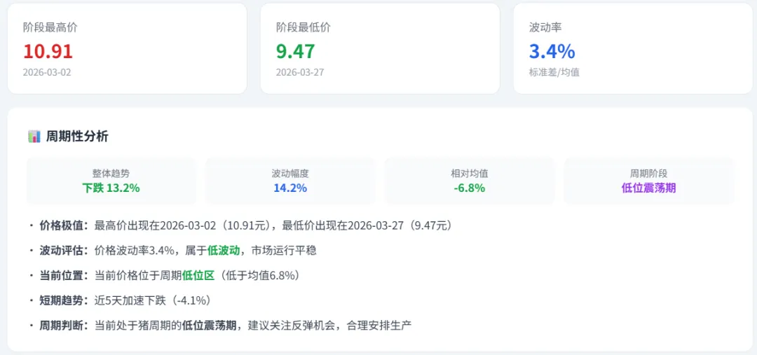 🔗 产销价差分析:猪肉(17.64) - 生猪(9.47) =8.17元(价差率86.3%)。价差率较高,屠宰利润丰厚,但终端消费承压,需警惕价格回调风险。