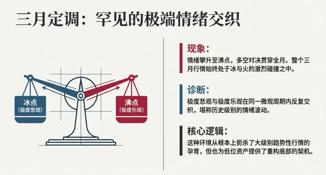 今日市场情绪再度攀升至沸点,整个三月行情始终处于冰与火的激烈碰撞之中。月中已进行过一轮复盘,而直至月尾,多空对决依然激烈。再次回顾本月极端行情的时间轴: