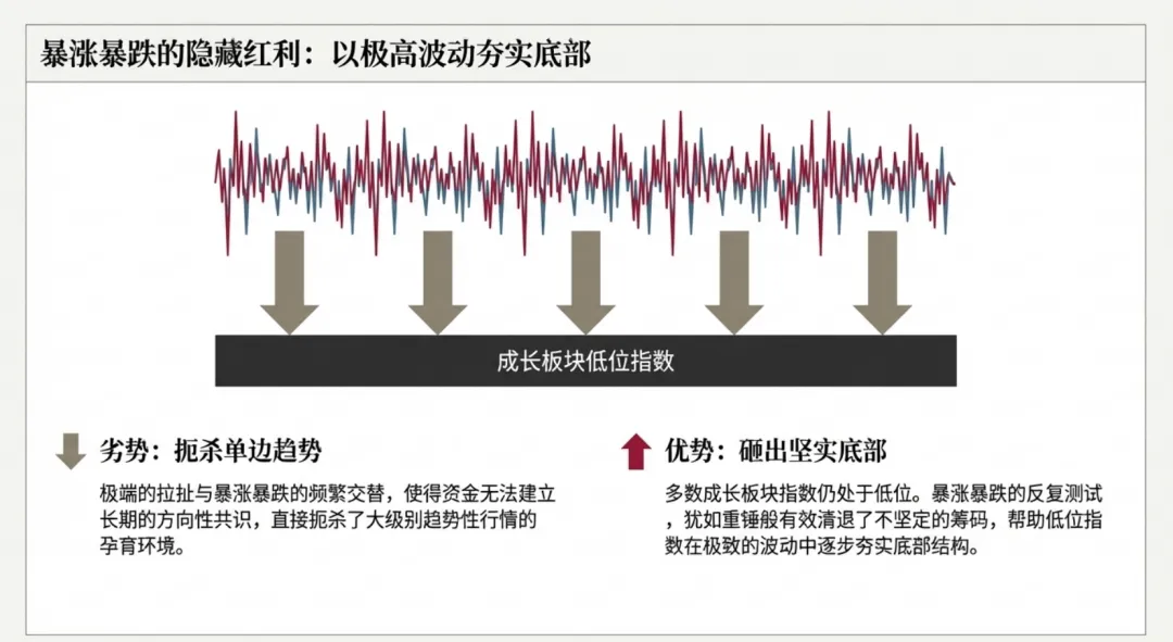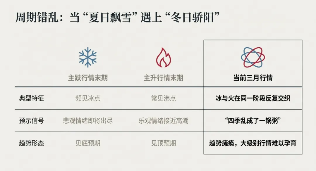 如此密集的冰点与沸点交替出现,实属罕见,堪称历史级别的情绪波动。一般而言,主跌行情末期多见冰点,往往意味着悲观情绪即将出尽;而主升行情末期则常见沸点,代表乐观情绪也已接近高潮。如今两者竟在同一阶段反复交织,不亚于夏日飘雪、冬日骄阳,四季乱成了一锅粥。在这种背景下,大级别的趋势性行情难以孕育。