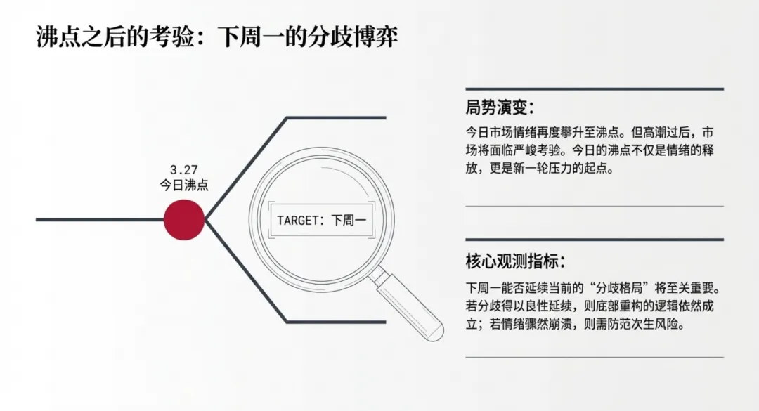 目前多数成长板块指数仍处于低位,暴涨暴跌虽不利于趋势的形成,却有助于低位指数逐步夯实底部。今日沸点过后,市场将再度面临考验。下周一能否延续当前的分歧格局,将至关重要。