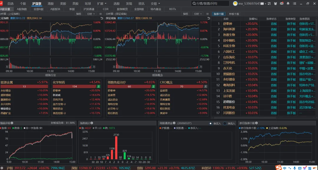 A股主要指数今日集体上涨,截至收盘,上证指数涨0.63%,深成指涨1.13%,创业板指涨0.71%,沪深京三市成交额18638亿元,较上日缩量932亿元,三市4337只个股上涨,1073只个股下跌。板块方面,能源金属、小金属、创新药、化肥、化学原料、贵金属、乳业、电池板块涨幅居前;电力、煤炭开采加工、银行、保险、港口航运、风电设备板块跌幅居前。今日电力板块跌幅虽靠前,但板块内仍有4家涨停板。