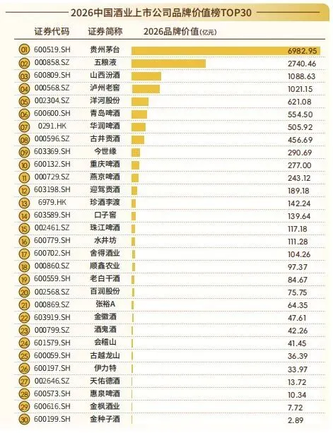 3月26日,2026酒业创新思享会在成都举行,论坛以“聚力向C 重构未来”为主题,聚焦行业深度调整之下的消费市场和资本市场新挑战,发布了“2026中国酒业上市公司品牌价值榜TOP30”,上榜企业合计品牌价值达16144亿元。