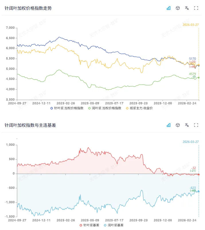 市场摘要:今日纸浆SP05合约区间震荡,针叶银星现货报价05+20附近,阔叶桉木报价4620附近,针阔叶报价维稳,刚需成交。期货端多空双增,多方主动性更强。