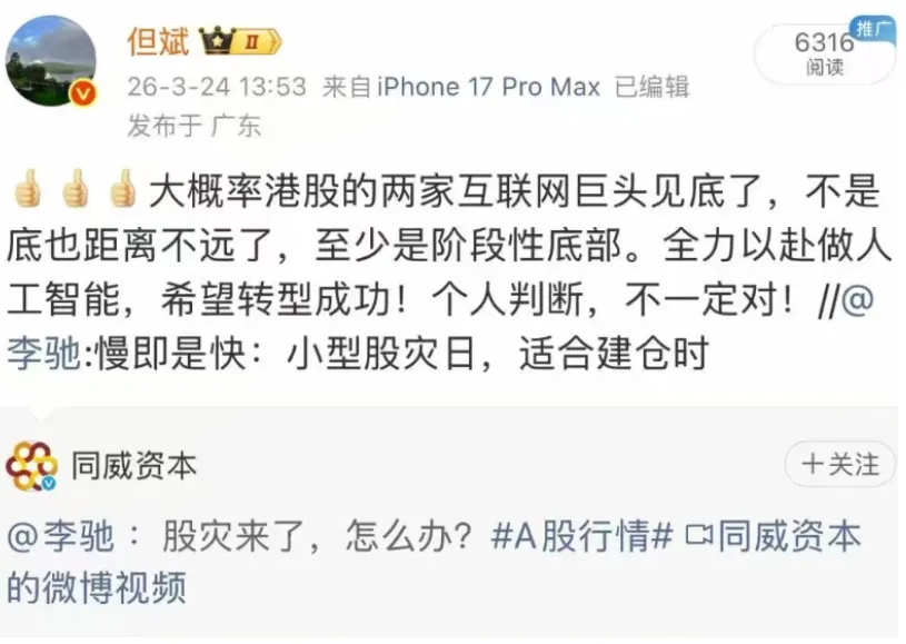 今天我A和港仔的表现还是可圈可点的,外围一片绿油油的情况下,他们一改跟跌不跟涨的历史表现,一反常态的逆势红盘,走出了独立行情。截止收盘,涨跌比为4337:1073,不过量能也在持续缩量,现在已经不足1.9万亿了。讲真,这个三月的股市是真的地狱级难度,绝大部分的交易日,动辄就是4000多家待涨,市场短线情绪完全被那金毛懂王带着走,追高杀跌最后怎么做都是错,别忘了,那个手搓K线的男人交易的就是市场的预期差。不过回顾历史,也属正常,A股每年都有一段时间是hard模式,对于长期耐心玩家不亚于一场修行了,稳住道心,继续熬着吧。那位道友说了,既然如此,何不空仓以待?这样似乎也有道理,尤其是股市严重的影响到了你的情绪,进而影响到了你的工作与生活的情况下,你从此清仓不再踏入股市,那此时清仓也不失为一个好的选择,此外,我们得回归到我们为啥来股市?来市场是赚钱的,空仓固然可以不亏钱,但也赚不到钱啊。对于投资,我们要有坚定的信仰,当你对市场失去信心时,不妨去翻阅下我们的党史,或者毛选,有时候真实的历史让人觉得像看爽文小说,但我们会发现,我党的几位元老,在最艰难的时候,常人都觉得不可能坚持的情况下,他们都坚持下来了,并且取得了最后的胜利。正确的投资姿势应该是风轻云淡,宠辱不惊的,如果你的持仓让你难受了,难受到吃不香睡不着的地步,无论涨跌,都可以先减一点,当投资成了一种煎熬,那说明你一开始就错了。在错误的状态里,即便得到了正确的结果,比如说就这么难受着,居然还让你赚到了,那么后面大概率你会加倍亏回去,这些都是血的教训。再谈谈最近跌上热搜的恒生科技,跌跌不休的恒科,使得连指数公司都坐不住了,直接官宣要优化成分股。而在前两天,中国两位价投大佬也同时发生,表示恒科两大巨头,也就是我们的化腾和马老师,大概率是见底了!但斌和李驰投资风格各有侧重,但内核高度一致:坚守价值,精选龙头,不被短期波动干扰。过去二十年间,两人凭借这套逻辑穿越多轮牛熊,也坐稳了中国私募圈的顶流位置。