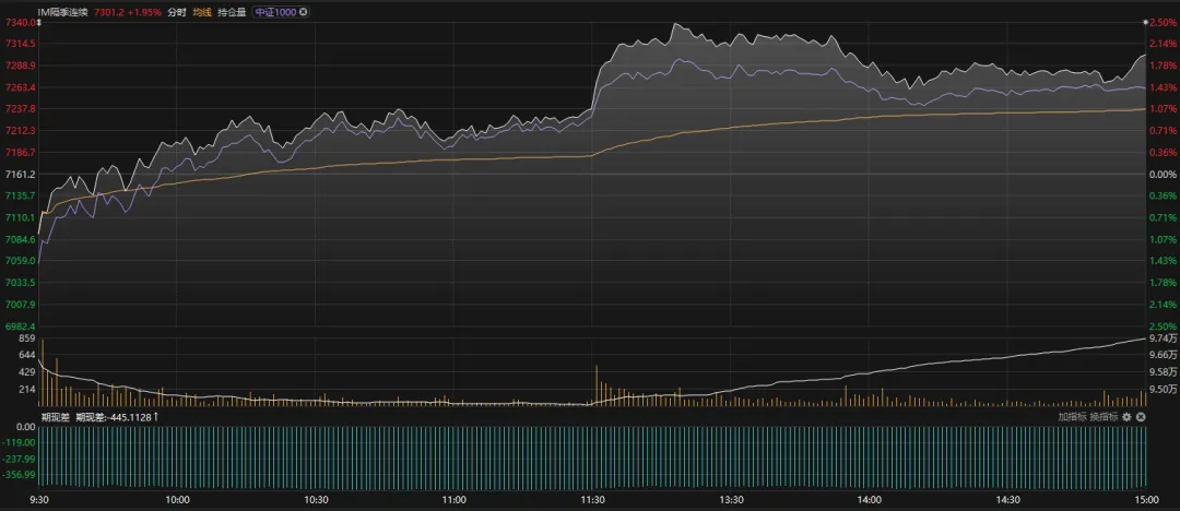 个股普涨,有利好的板块有连板。期指贴水略微下降,下午收盘在-445(较昨日+41点,如下图),这2天,指数涨贴水减少,指数下跌贴水增加,主力资金也是在根据消息做应变。没有明确方向。