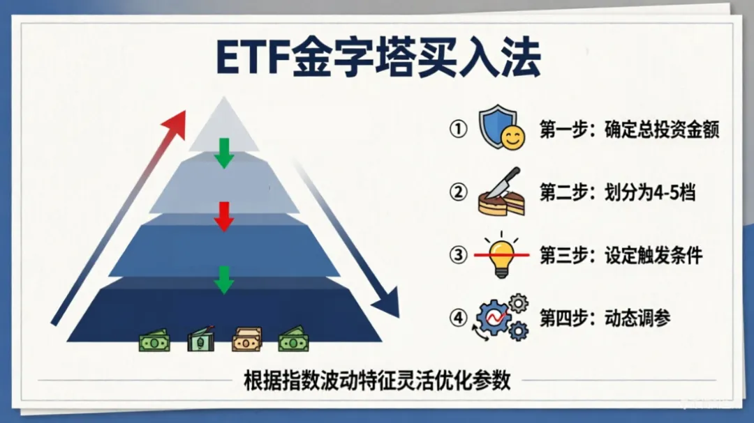 “越跌越买”在宽基ETF上的落地,核心采用倒金字塔买入法,核心思想是“低位多买、高位少买”,通过规则化分批不等额交易优化持仓成本,具体分四步操作: