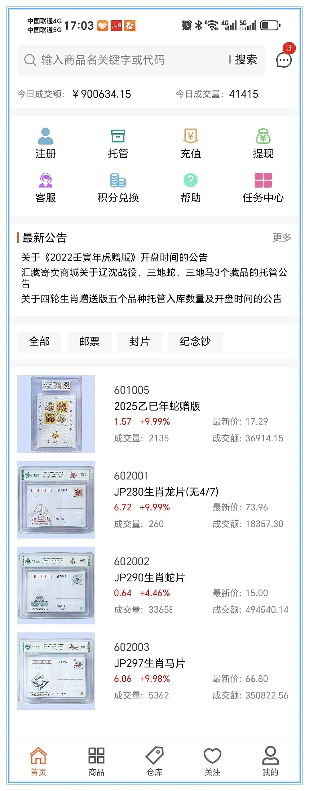 汇藏寄卖:3月27日,大盘高开高走,四轮蛇赠送版继续一字板涨停,开始小幅放量成交;龙片、蛇片、马片集体放量大涨,大盘大幅放量,一改往日低沉的局面,大盘成交90.06万元,比昨天大幅放量51.58万元,三个邮资片成交39280枚,总换手率创纪录的29.87%,大盘趋势向好。