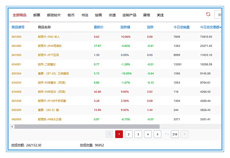 今天大盘成交24.22万元,比昨天放量3.5万元,其中邮票板块成交5.42万元,占22.40%;封片板块成交16.13万元,占66.59%;钱币板块成交2.67万元,占11.01%,封片板块成交较好。