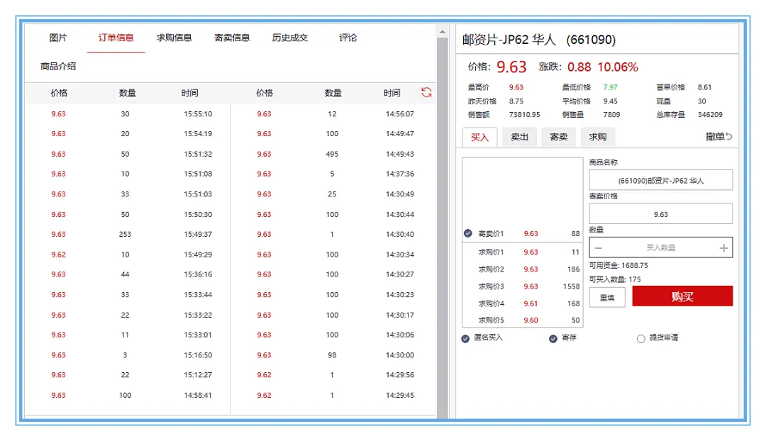 今天还是华人表现突出,开盘不久便稳步上扬,全天放量涨停,涨停成交7809枚7.38万元,已连续13涨8板,在低迷的大盘中表现分外耀眼;主席片连续2天调整,成交放量,看好者众多,今天放量成交1363枚2.33万元,宝刀不老;五四片、二版壹分、三峡截流、53年壹分无油等品种低位放量,表现突出。