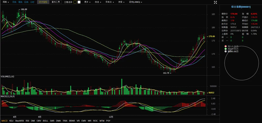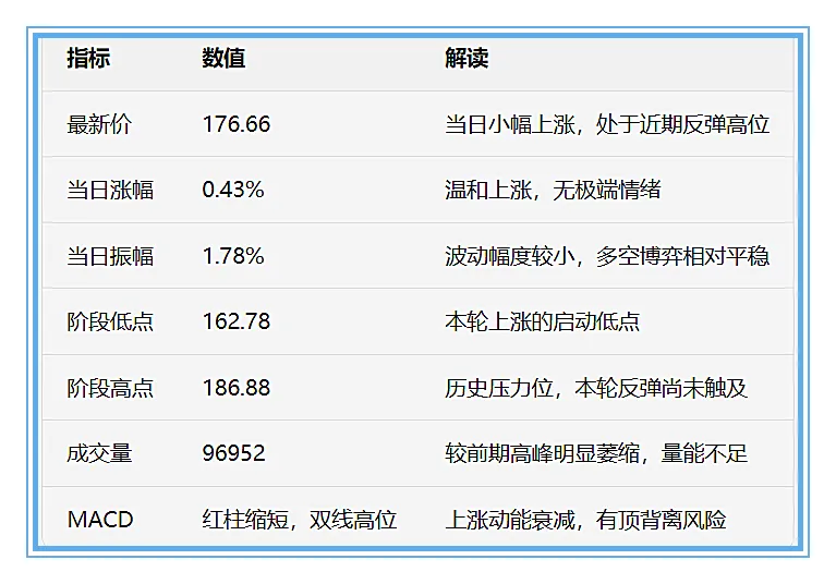 关键位置:强支撑170-172区间(短期均线密集区+前期震荡平台上沿);强压力178-180区间(前期反弹高点+历史压力位186.88的前哨);终极压力186.88历史高点。