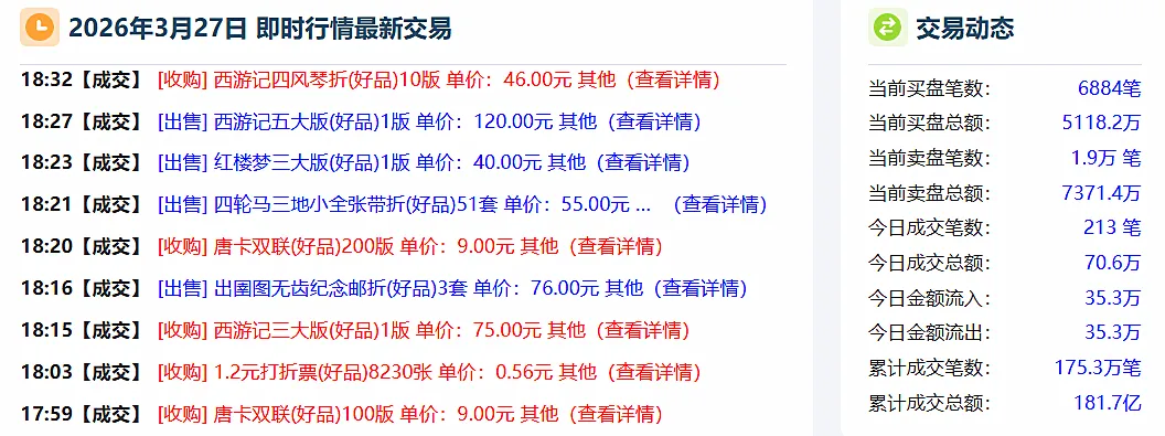 互动网:3月26日,互动网成交108万元,其中十八大大版成交2400版12万元,出圉图无齿纪念邮折关注度最高;截至3月27日18:50互动网成交70.6万元,行情变化快,随时关注行情变化。