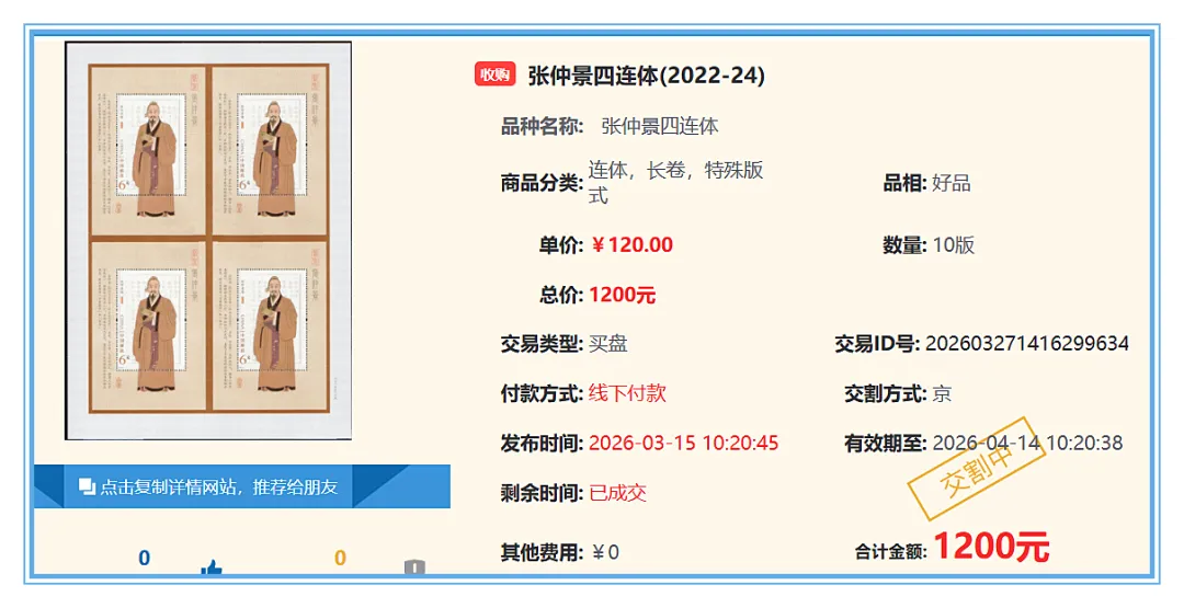 红楼梦五小型张(评级版)1刀15500元,五牛图小型张(评级版)2刀5540元,货郎图小型张(互动金标)4刀4150元,高逸图小型张(评级版)2刀2968元,浴马图小型张(评级版)3刀2560元,九运会小全张(评级版)5刀1000元,江山如此多娇小型张200张23.50元,书法篆书二小版150版14.50元,十五运小版200版9.00元,四轮蛇赠送版800版6.50元,五牛图双联20本21.50元,莫高窟二双联54版35.50元,张仲景四连体10版120元,数学之美大版100版38.88元,2025年总公司预定册100本115元。