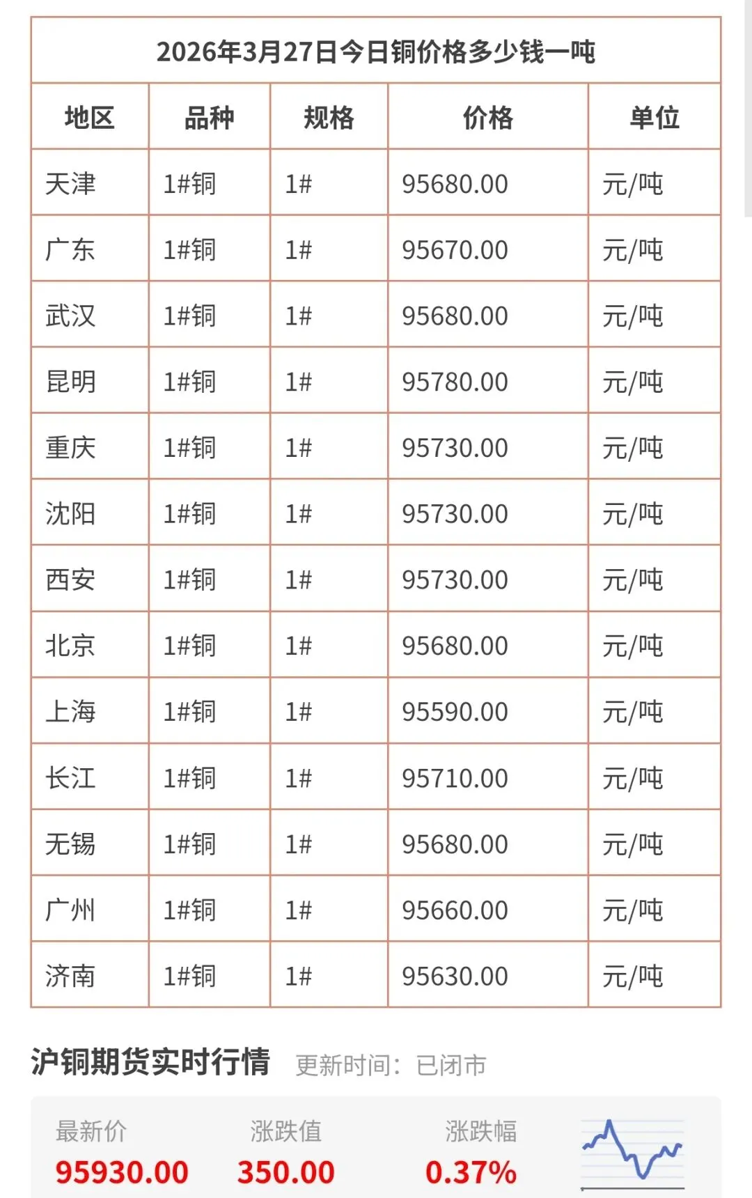 3月27日更新,今天铜价实时查询!最新今日铜价格多少钱一吨,包括广东、武汉、昆明、西安、无锡、天津等地区现货铜价格