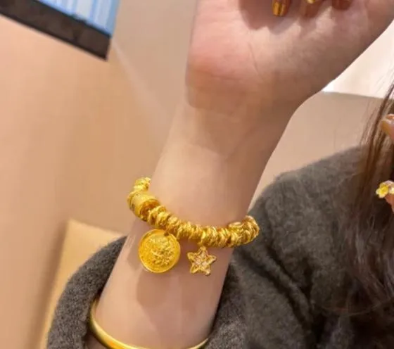 现在正在发生的是:我坐着刷屏,手腕一抬,串珠挤在一起发出很轻的响,圆牌和小星星坠在灯下闪一下——我下意识又把袖口往上拽一点。更准确地说,是我先被那一下“压着”的存在感拽回现实,然后才想起它怎么来的:那阵子我记得不太准,大概是某个阶段在店里试戴时,柜台灯一照,金色亮得有点“太认真”。我本来把手收回了,嘴上还改口说“我就看看”,结果又问了一句“这个扣子会不会刮”,工作人员把扣子翻给我看,我盯着那粒小扣的开合、还有坠子边缘的纹路,犹豫着或——干脆就当成日常的小标记。最后它没变成“压箱底”,倒是先变成我抬手时会注意的那一点点重量。