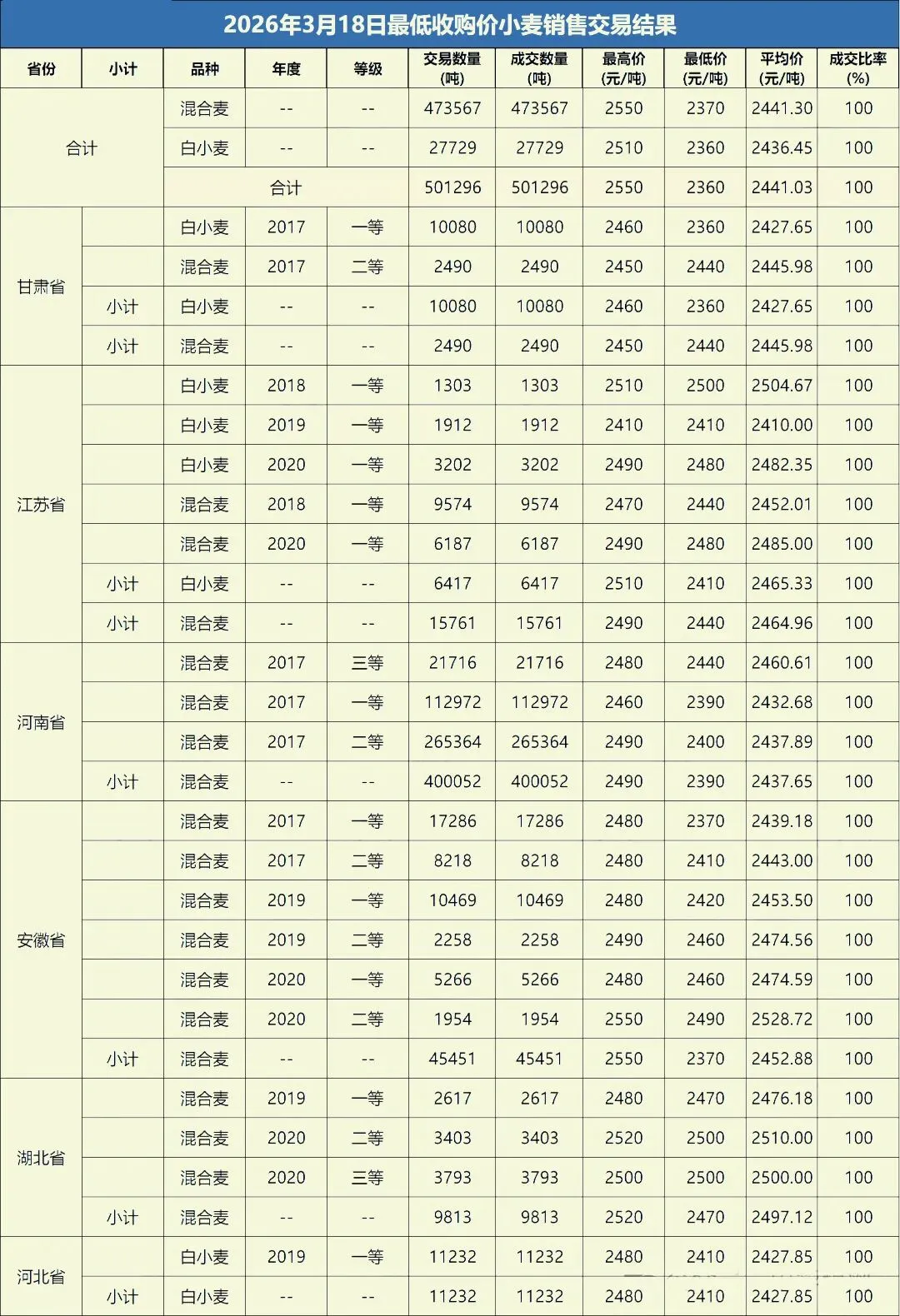 3 月 18 日最低收购价小麦计划销售 501296 吨,全部成交。最高价 2550 元 / 吨,最低价 2360 元 / 吨,成交均价 2441 元 / 吨。成交结果显示,市场粮源需求强劲,面粉及饲料企业参拍积极性高涨,看涨情绪持续升温。