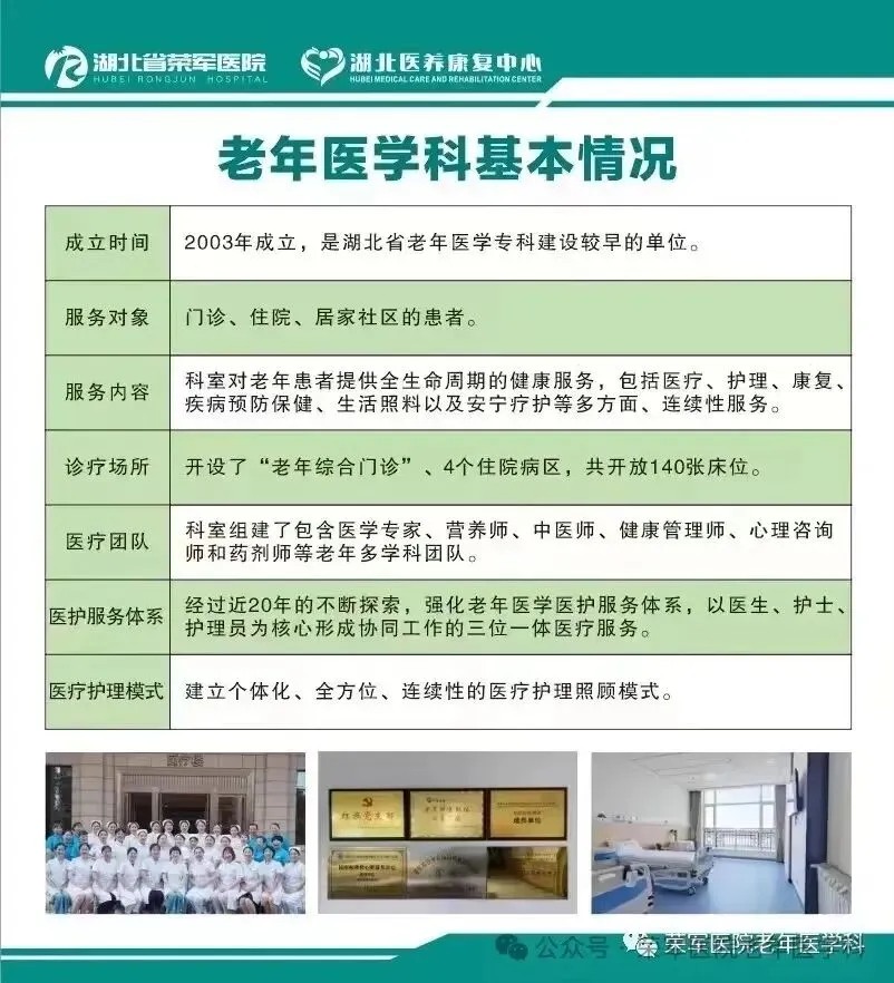 湖北省荣军优抚医院老年医学科自2003年建立以来,致力于满足老年患者的全面医疗需求。通过“五全服务”模式提供个性化、连续性的医护服务。科室设有老年综合门诊和4个住院病区,共140张床位,为老年人提供医疗、护理、康复、生活照料和安宁疗护等服务。科室医护体系包括医学专家、中医师、健康管理师等。在医疗方面,科室通过个体化的诊疗、康复项目以及传统中医药治疗,关注老年共病管理、老年营养、老年康复、认知障碍、安宁疗护等问题。荣获多项荣誉,加入国家老年疾病临床研究中心网络协同单位,持续为老年患者提供医疗护理服务,特别关注老年退役军人、优抚对象及社会老年患者的医疗护理需求。