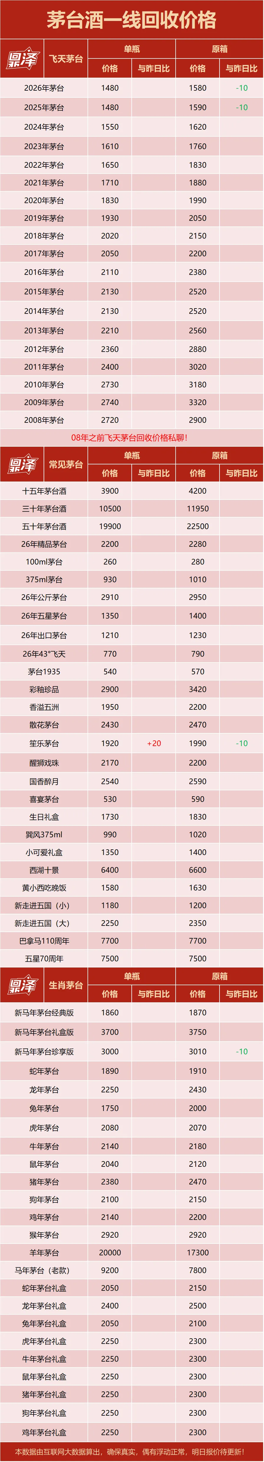 Step >> 价格解析 ✅ 行情价:本公众号发布的价格是行情价格,是全国酒商调该品类茅台的价格,是零售价和回收价的基准价格。 ✅ 销售价:销售价格一般高于行情价格,在行情价格的基础上,包含了运营、仓储、物流及合理利润等费用。 ✅ 回收价:回收价格一般低于行情价格,在行情价格的基础上,包含了鉴定费、人员的差旅费、合理利润等费用。 特别说明:鼎泽礼汇为全国礼品回收信息交流平台,商品信息均未含税、未包括物流费、人工费等必要成本。本平台行情价均来自于各地合作商家,其真实性、准确性和合法性由信息拥有者(合作方)负责。鼎泽礼汇不提供任何保证,不承担任何法律责任。 |