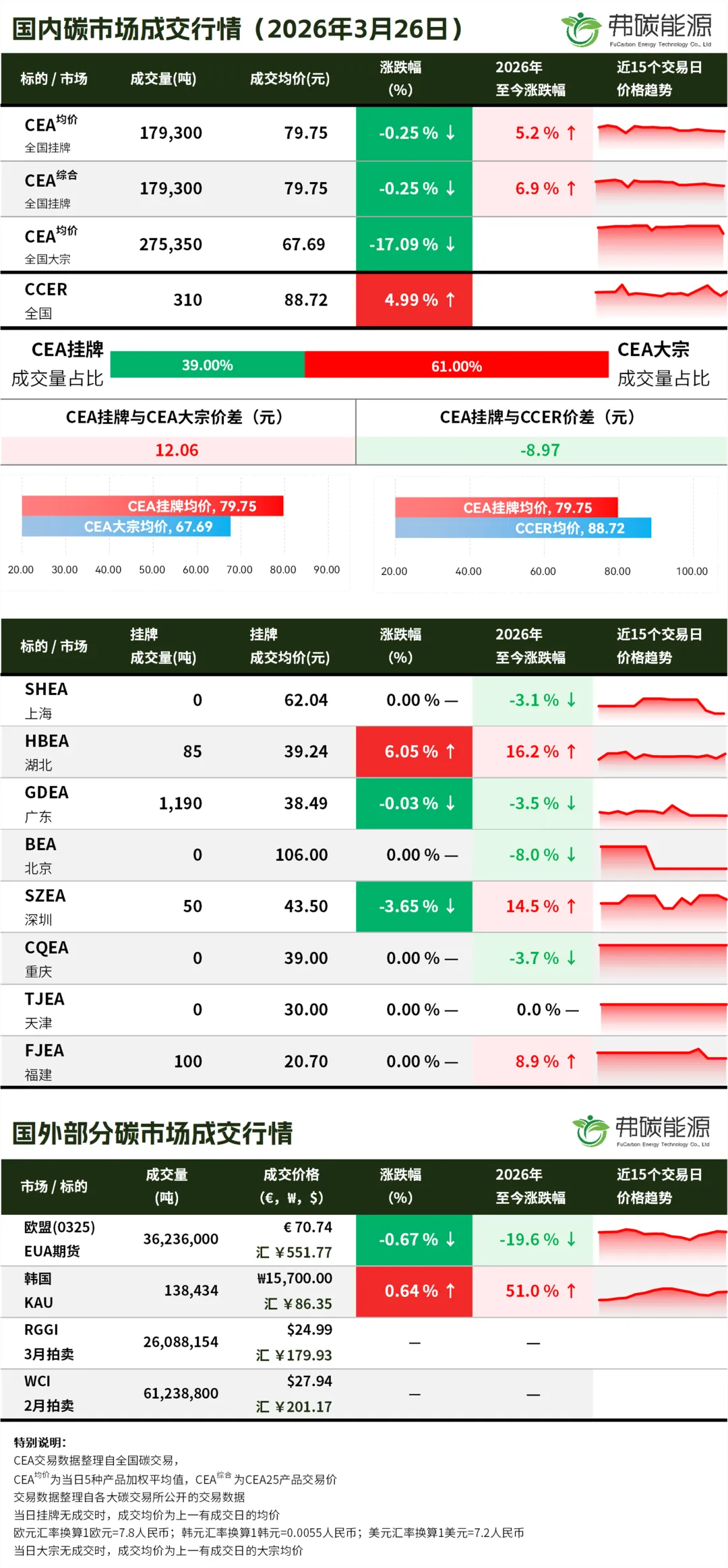 碳市行情26.3.26 | CEA挂牌成交17.9万吨,成交均价下跌...