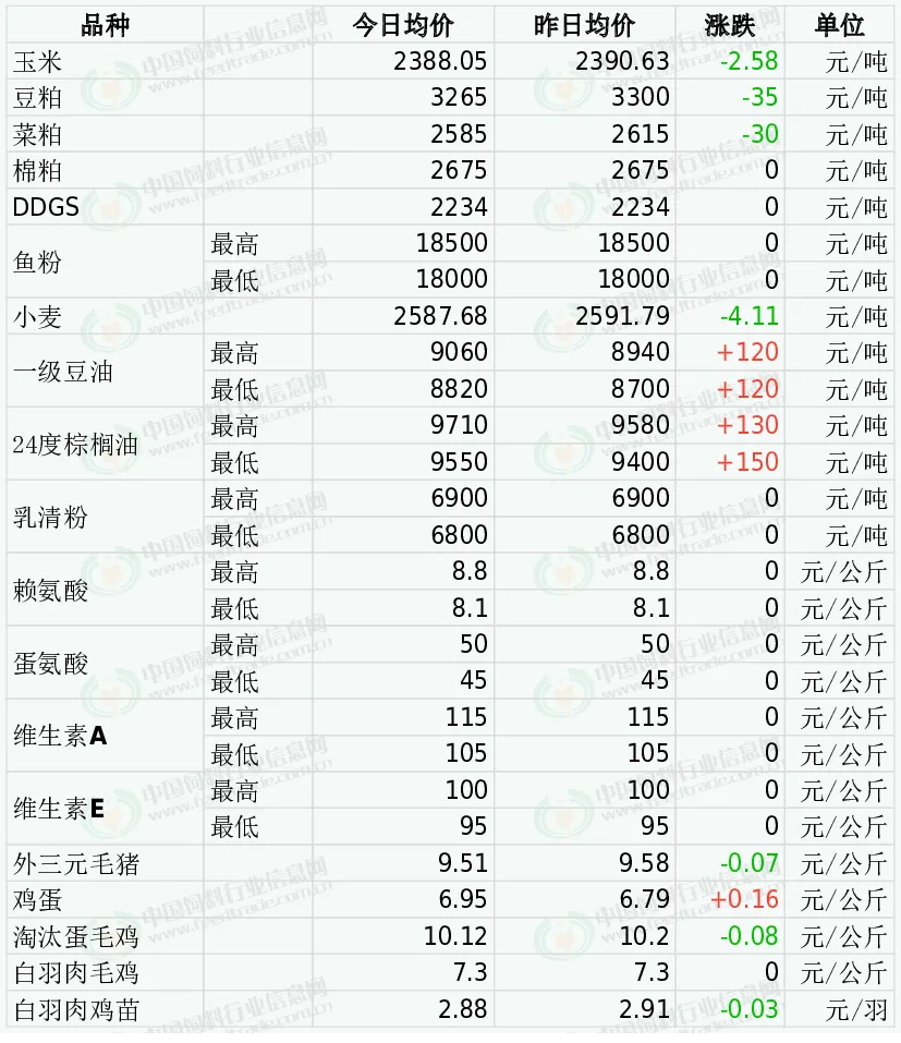 27日DDGS价格坚挺。近期酒精企业多消化前期合同,贸易市场走货表现一般,饲料企业采购心态减弱,观望心态增加,且多消化前期库存。3月份,我国玉米深加工企业节后将陆续复产,但随着主产品销售淡季来临开机率相比春节前将适度下降,DDGS新增产供量适度下降的几率逐步提高。原料玉米价格持续上涨生产成本上涨,需求端养殖及饲料生产所消耗DDGS数量将止降转增长新增采购需求量将止降转增长,利多支撑在逐步增强,预判3月份期间大多数时候产区DDGS交易价格总体稳中略显偏强走势为主的可能性更大下旬止涨转弱的几率将逐步提高,月度均价环比继续上涨的几率在逐步提高。因大豆出口销售强劲,加之国际原油期货继续走强支撑,CBOT大豆期货收盘略微上涨,基准期约收高0.2%。目前通关的大豆数量较少叠加不少需求端提走前期购买的合同后豆粕库存下降,支撑工厂对豆粕的挺价意愿。不过后期通关大豆数量增多将缓解当前供应偏紧态势,豆粕库存有望止跌回升,且生猪养殖亏损导致需求有限,豆粕价格或处于震荡偏弱运行行情。今日棉粕市场价格波动有限。巴西放宽对华大豆出口转运检验限制,近端大豆流通及到港节奏担忧缓解,带动豆粕估值回归,利空豆粕。不过棉粕产出恢复慢,供应端压力不大,并且棉籽价格坚挺,对其成本支撑,其中新疆昌吉棉籽为1.3-1.35元。预计棉粕价格震荡偏强。今日郑州菜粕期货低开下跌后震荡调整为主。加拿大油菜籽期货继续上涨,基准期约收高0.30%,追随外部植物油市场的涨势。菜粕现货小幅下跌。国内菜籽粕现货市场成交清淡,受沿海压榨厂开机稳定、远月菜籽粕供应预期充足等影响,市场保持观望,以刚需采购为主,现货报价承压下跌。短期继续震荡调整为主。外盘方面,秘鲁鱼粉厂商保持挺价意愿,秘鲁新季超级蒸汽鱼粉预售参考价格为CNF2500美元/吨。国内进口鱼粉市场,鱼粉到货慢,库存下降至15万吨以下。当前秘鲁超级蒸汽鱼粉价格集中在18400-18500元。同时国产鱼粉货少,支撑价格坚挺,山东荣成地区63%蛋白TVN150的国产鱼粉参考报价在15300元/吨。短期鱼粉持货商保持观望挺价。今日小麦市场价格继续偏弱调整。政策投放加码投放,市场流通粮源增多,贸易商与农户出货意愿增强,企业到货量上升,价格继续回落。而面粉消费正处于淡季,面企采购谨慎多以刚需补库为主,同时玉米价格回落,小麦的饲用替代有所下降,部分饲料企业采购意愿减弱,小麦价格以偏弱运行为主。昨日油脂期货价格震荡,国际原油震荡走强,强化生物柴油原料需求预期,叠加近期美国生柴政策即将落地,油脂价格震荡运行,后期关注政策变化。受外盘油脂走强、国内期货提振以及大豆到港偏紧、油厂开机有限等因素支撑,豆油现货价格同步上行,下游刚需补库带动成交有所好转,不过随着后续大豆到港预期增加、供应将逐步宽松,豆油价格上行空间受限,预计近期豆油现货价格震荡调整,需警惕高位回落风险。受战争影响,运价上涨,到港时间延长,下游采购意愿增加,乳清粉市场购销好转,稳中偏强运行,后续需注意到货量进展以及港口库存量等因素。2025年12月,我国赖氨酸与赖氨酸盐及酯的出口量为9.8万吨,同比增0.4%,环比增8.4%。3月3日起星湖伊品氨基酸产品上调200-300元/吨。3月5日大成生化氨基酸产品上调100-500元/吨。3月6日金玉锋98%赖氨酸报价6.65元/公斤,70%赖氨酸报价4.65元/公斤。3月9日星湖伊品大品种氨基酸上调200-1000元/吨。3月16日星湖伊品大品种氨基酸上调300-1000元/吨。2025年12月国内蛋氨酸进口量为2.1万吨,同比增10.6%,环比增66%2月27日市场称安迪苏液蛋计划提价1元/公斤。3月4日市场称固蛋厂家多为停报。3月6日市场称赢创蛋氨酸报价上调10%。3月9日市场称赢创新加坡工厂受原料短缺影响,蛋氨酸部分生产设施被迫停产。3月19日新和成液蛋报价上调20%,蛋氨酸市场偏强运行。欧洲VA1000市场报价16-17欧元/公斤。2026年1月市场称国内部分厂家VA产品提价至70-75元/公斤。3月9日市场称国内厂家停报,3月24日市场称有厂家报价150元/公斤,市场成交上行。欧洲VE市场报价7-8欧元/公斤。2月5日市场称新和成VE产品出口报价上调15%。3月初部分厂家VE产品提价至75元/公斤,3月23日市场称国内有厂家提价至120元/公斤,VE市场偏强运行。全国均价为9.51元/公斤,较昨日价格下跌0.75%。当前市场仍处供应高峰,养殖端深度亏损,虽有收储及产能调控政策托底,但短期效果有限。终端消费依旧疲软,屠宰走货一般,预计近期猪价仍震荡偏弱。今日鸡蛋价格小幅上涨。市场处于供应紧平衡状态,库存偏低,叠加清明节前备货启动、猪肉与蔬菜价格带来的替代需求支撑,同时鸡蛋期货继续走强对现货形成支撑,不过产蛋鸡存栏仍处相对高位,叠加清明备货已接近尾声,预计近期鸡蛋价格震荡运行,后续需警惕价格回调风险。今日主产区山东鸡蛋均价6.74元/公斤,较昨日价格上涨0.20;河北鸡蛋均价6.50元/公斤,较昨日价格上涨0.17;广东鸡蛋均价7.27元/公斤,与昨日价格持平;北京鸡蛋均价6.92元/公斤,较昨日价格上涨0.22。全国淘汰蛋毛鸡均价稳中偏弱。市场淘汰鸡货源供应相对充足,而终端屠宰企业采购需求未有明显提升,加之市场消费端暂无利好刺激,部分地区淘汰鸡价格出现小幅下调。短期淘汰鸡市场缺乏利好支撑,价格难有大幅波动,预计近期淘汰鸡价格仍将稳中偏弱运行。今日山东地区淘汰蛋毛