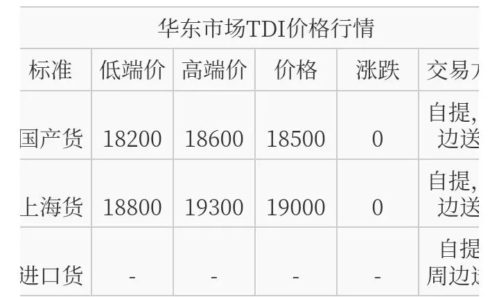 华东TDI国产货报盘价格在18200-18600元/吨;上海货报盘价格在18800-19300元/吨附近。