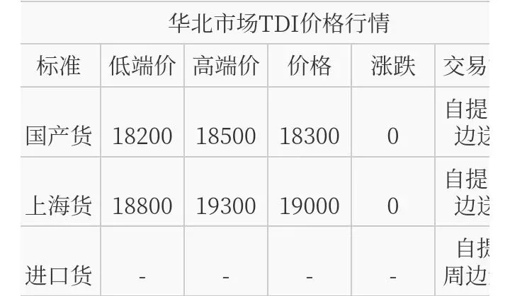 华北TDI国产货报盘价格在18200-18500元/吨,上海货报盘价格在18800-19300元/吨。