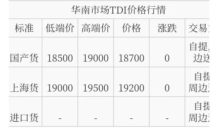 华南TDI国产货报盘价格在18500-19000元/吨,上海货报盘价格在19000-19500元/吨,报盘宽泛。