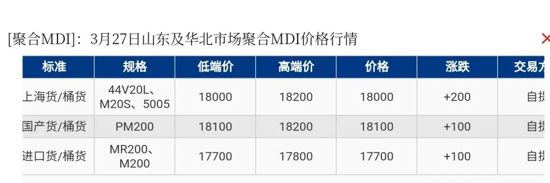 【市场动态】山东及华北区域聚合MDI上海货报盘18000-18200元/吨,国产货(PM200)报盘18100-18200元/吨,进口货报盘17700-17800元/吨。