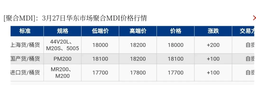 【市场动态】华东区域聚合MDI上海货报盘18000-18200元/吨,国产货源(PM200)报盘18100-18200元/吨,进口货报盘17700-17800元/吨。