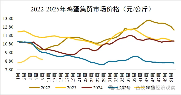 鸡蛋价格延续跌势:全国鸡蛋平均价格8.99元/公斤,比前一周下跌0.9%,同比下跌8.3%。河北、辽宁等10个主产省份鸡蛋价格7.67元/公斤,比前一周下跌1.8%,同比下跌6.7%。