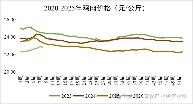 鸡肉价格由涨转跌:全国鸡肉平均价格22.83元/公斤,比前一周下跌0.3%,同比下跌1.6%。商品代蛋雏鸡平均价格3.65元/只,比前一周上涨0.6%,同比下跌11.6%。商品代肉雏鸡平均价格3.37元/只,比前一周上涨0.6%,同比下跌0.9%。