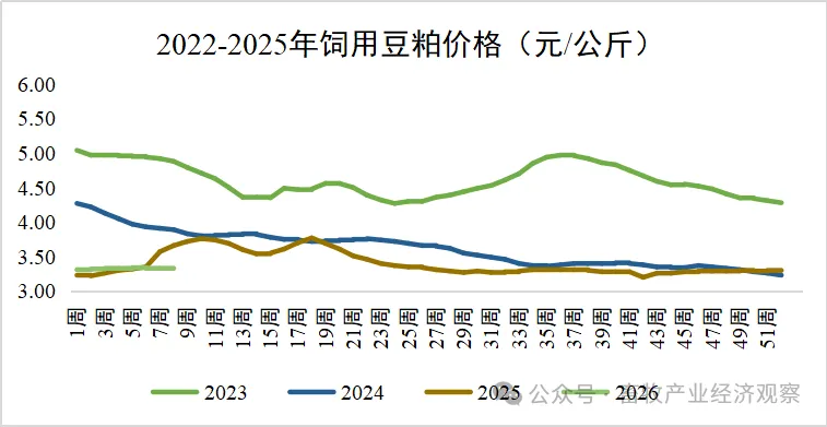 豆粕价格平稳运行:全国豆粕平均价格3.32元/公斤,与前一周持平,同比下跌10.8%。