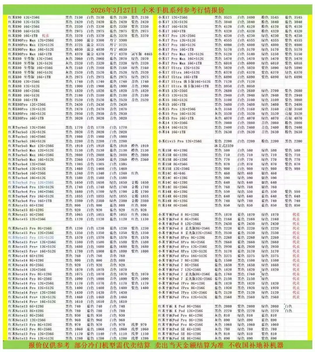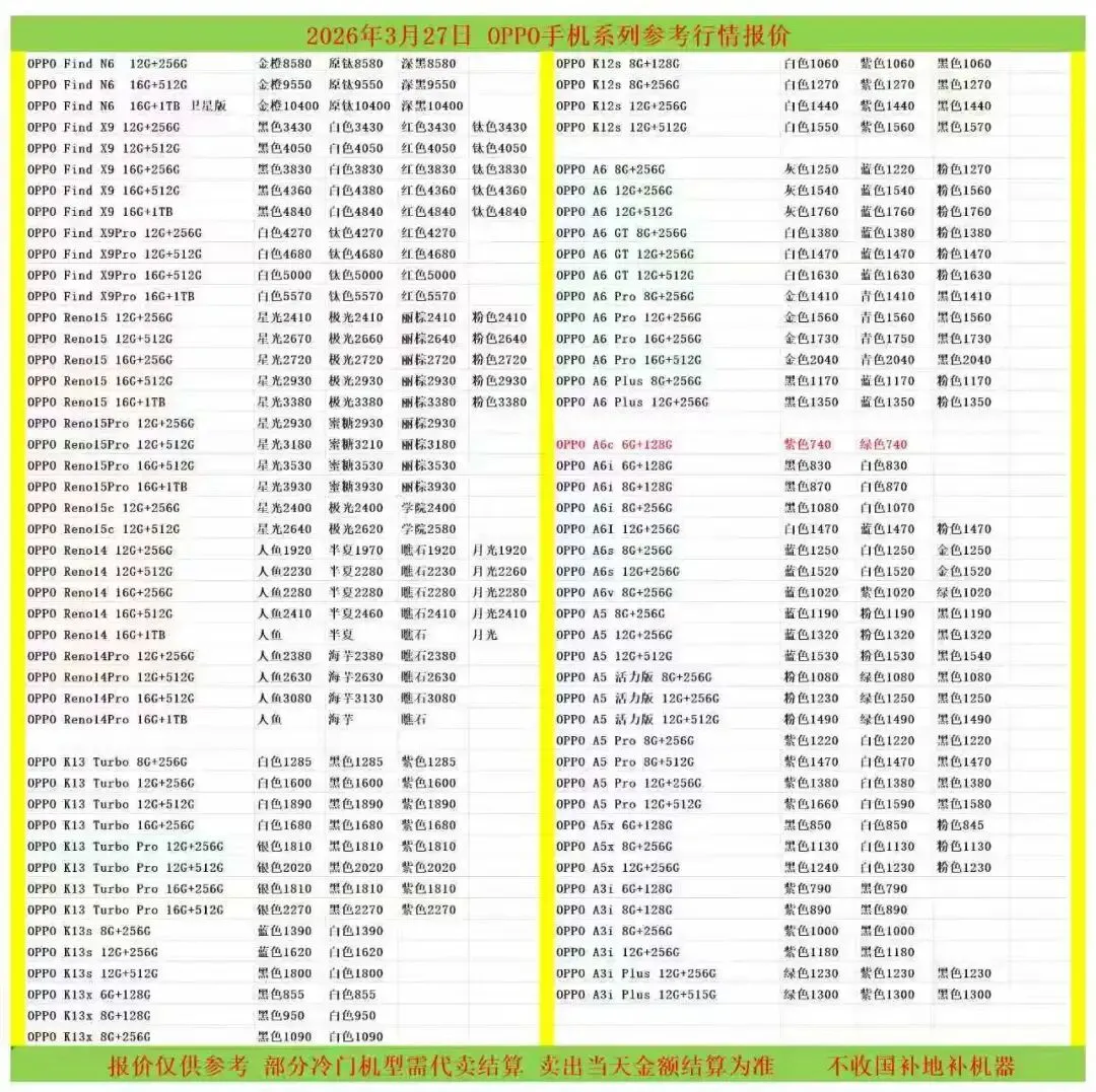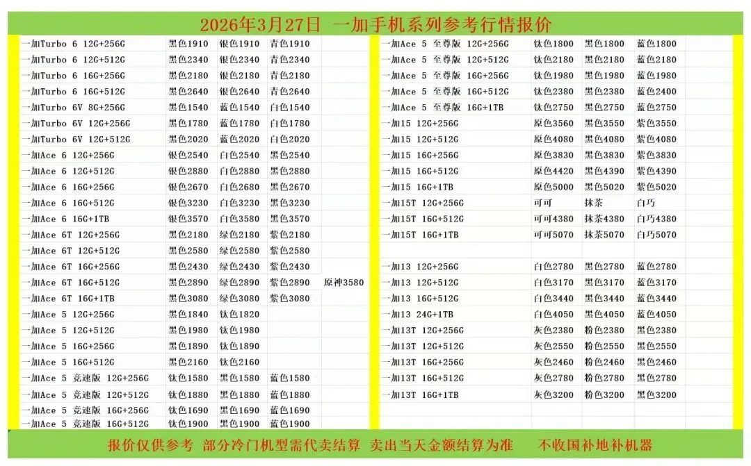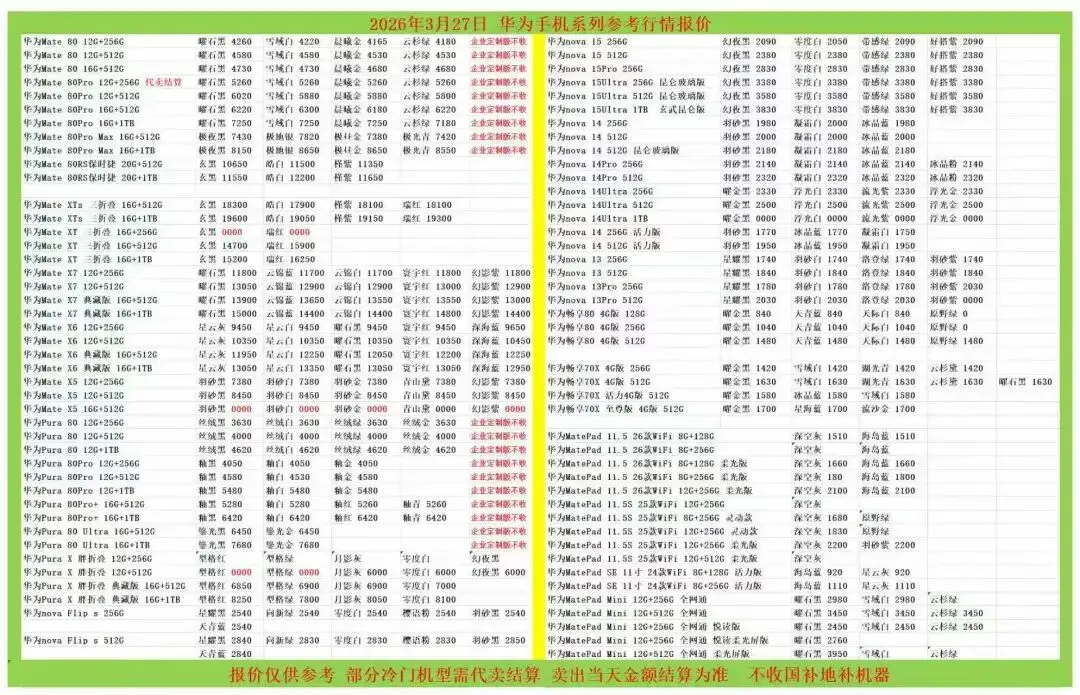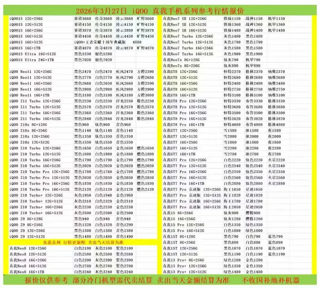 (1)二级市场为自由交易市场,价格实时波动,可能每个小时的卖价都不一样,此报价为华强北市场收货参考行情,实际结算价见公众号:鸟哥撸货数码结算价。