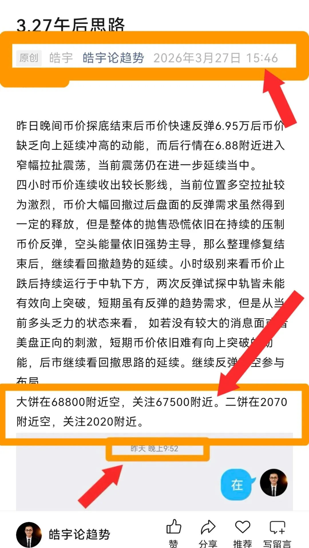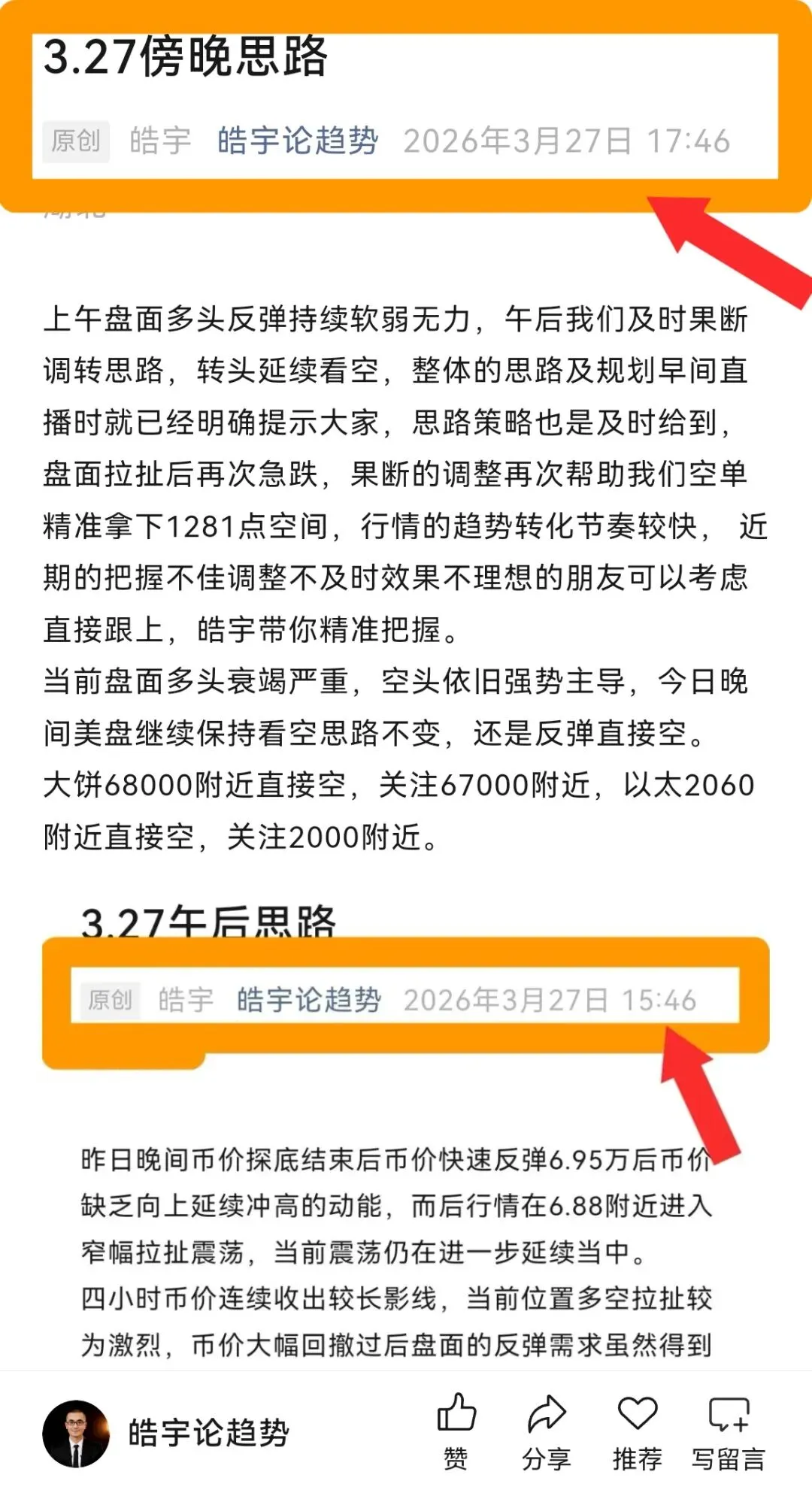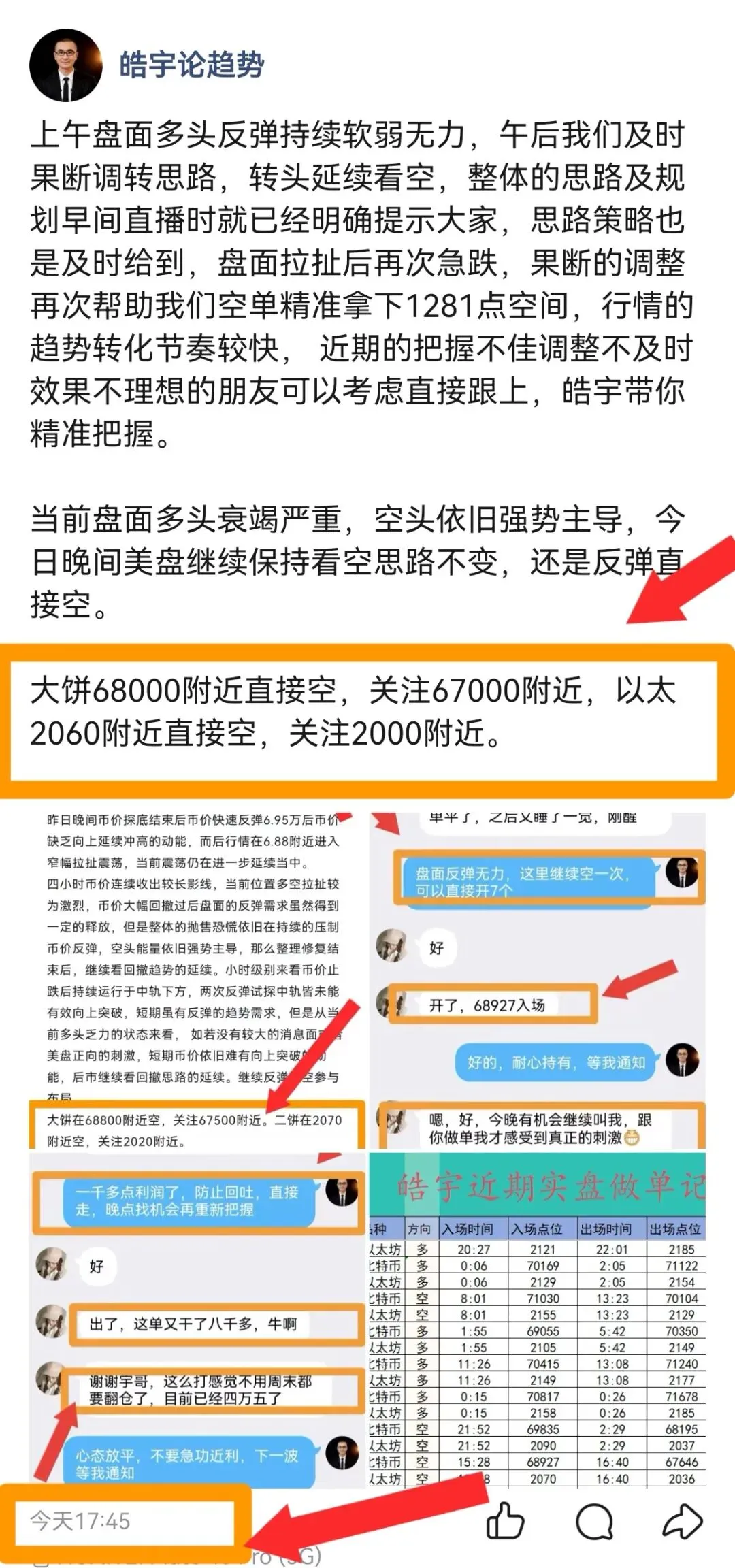 日内行情再次即将走完,早间币价持续整理修复,今日午后,币价再次启动连续大幅回撤的趋势,当前币价的下行节奏虽有所减缓,但是截止目前依旧未见有力的反弹,回顾日内实盘,早间推送短多看反弹修复思路,午间币价多次反弹无力,午后我们也是第一时间及时调整思路果断布局空单,午后在68927布局入场的空单在67646点位精准拿下1281点空间,随后给到的预期再次布局空单,从67757拿到66422再斩1335点空间,日内实盘完美拿下的同时也是为本周交易日实盘画上完美的句号,犹豫只会败北,果断才是后市的趋势之王。
