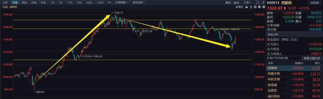但是也正是由于创新药的业绩够硬,所以调整的方式主要还是以时间换空间为主,从8月高点,到本周最低点,也就是从1500调整到1200而已,20%的振幅。只要不是追在最高的山尖尖上的,追的稍微早一点,或者抄底稍晚一点,普遍套个十来个点而已。而且1月份17连阳的时候,也给了站着出来的机会。但凡是去年要信早信,四五月份就上车的,当下应该还有利润!如果从业绩爆发和洗盘时间都角度看,当下确实可以关注一下了。思路跟午评文章里的一样,就是用均线跟随即可。或者如上图画的压力线,还是去年7、8月份画的了。什么时候站上,什么时候关注。