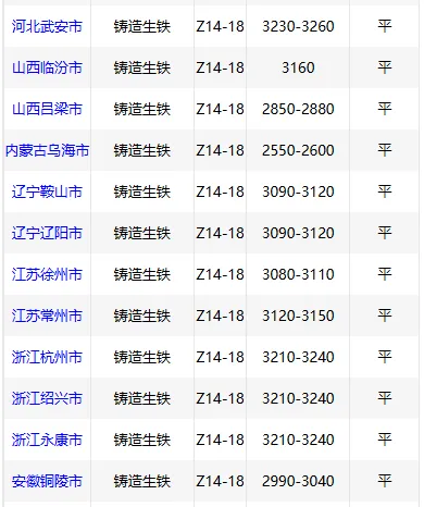 3月27日华南铸造 生铁价格稳,Z18广西3020,高州3060,阳江3060,现金含税。(单位:元/吨)