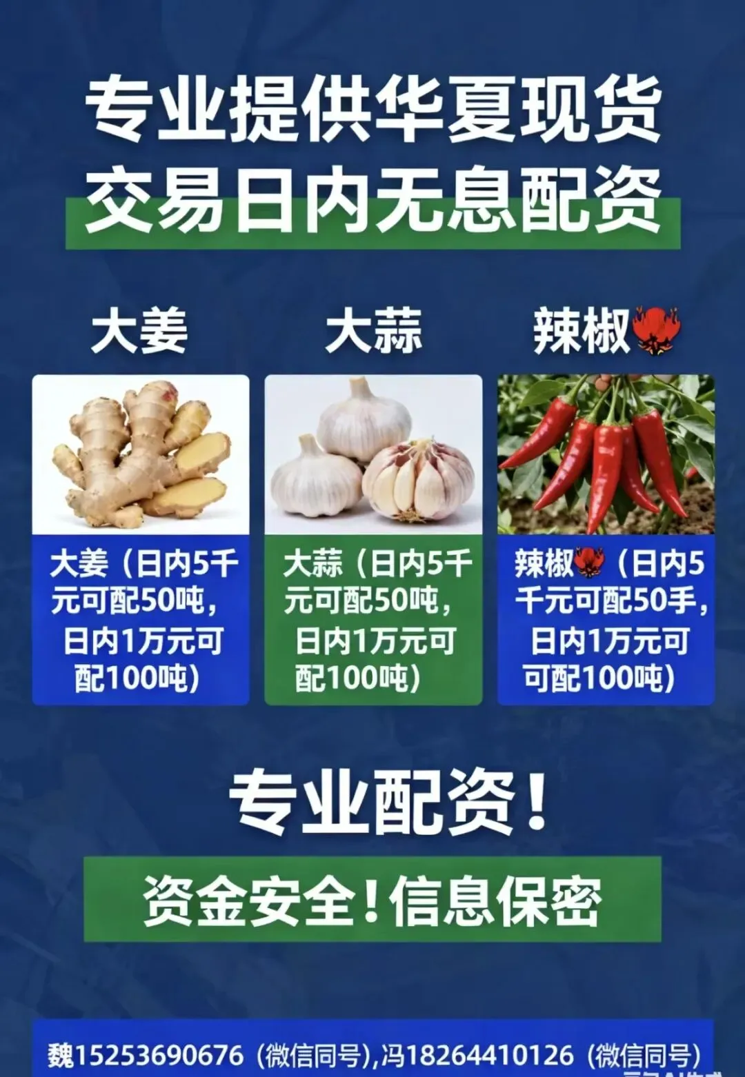 11.河北石家庄硬三两青苗60吨,无芽无毛病;安丘当地圆头硬三两货到大风干100吨无毛病可散拉;安徽青苗150吨,价格便宜;当地圆头老黄姜80吨,出成高可散拉 电话:18863682866 13964632988