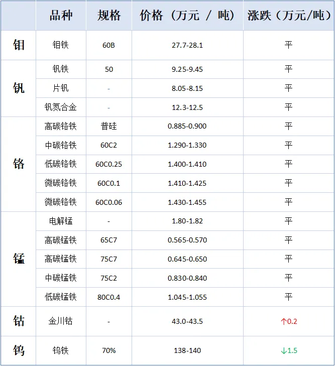 今日导读:钼价、钒价继续持平,钴价小幅回升,锰价持稳运行,铬价相对坚挺,钨价继续下跌。