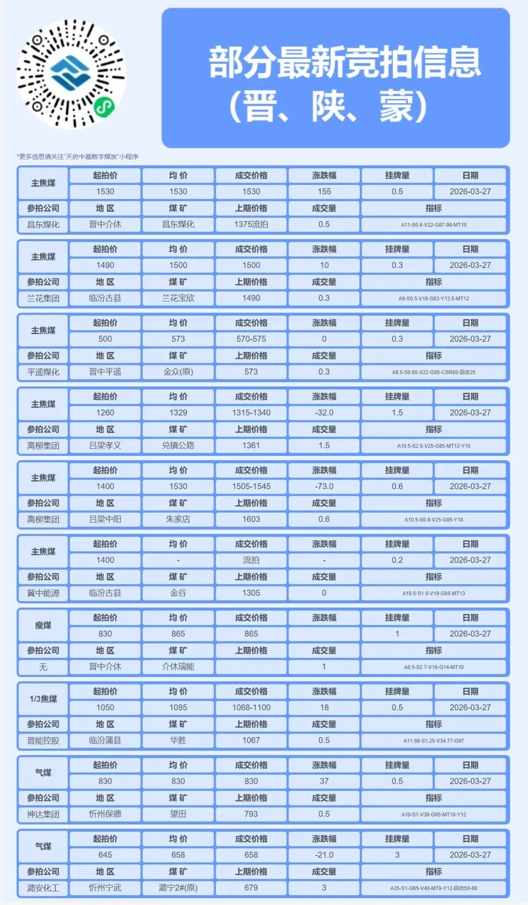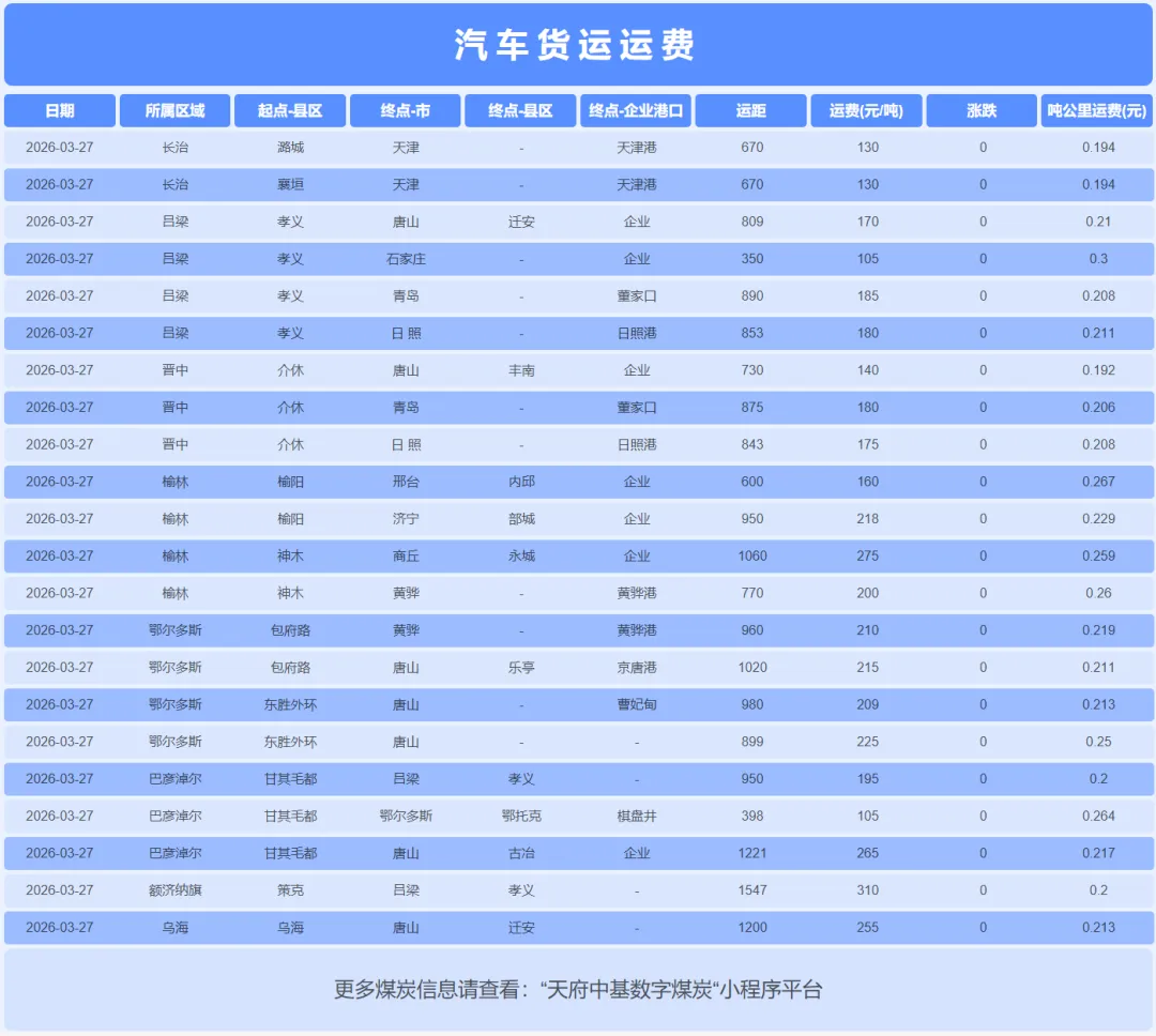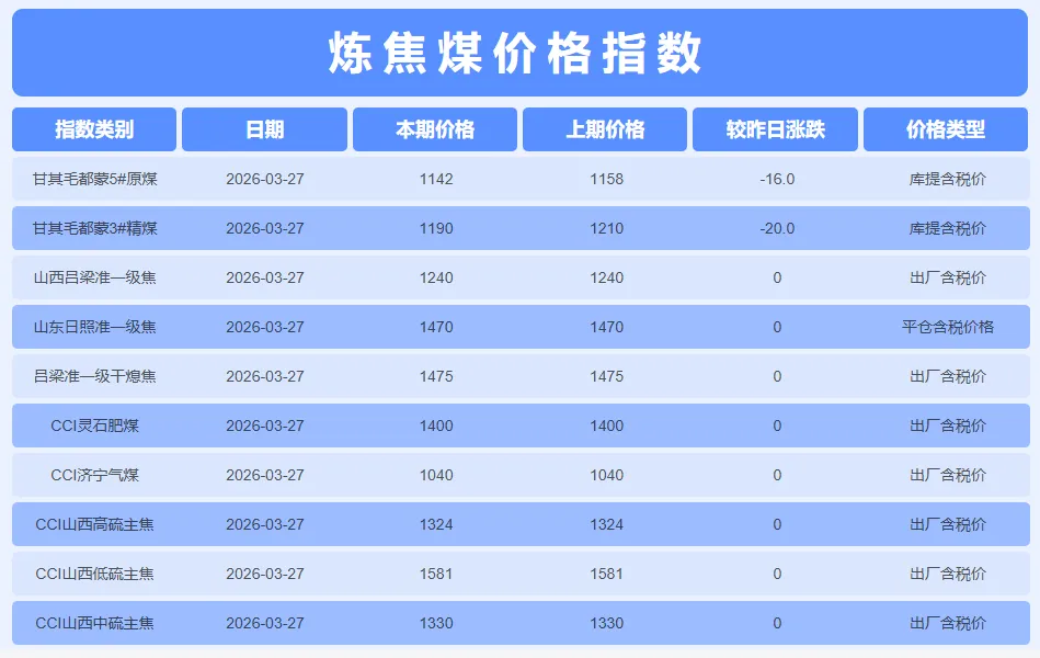 2026年3月27日,焦煤焦炭市场呈现 “现货持稳、期货回调、内外分化、提涨落地” 的复杂局面。国内焦煤现货价格全线持稳,山西各主焦煤、肥煤及气煤出厂价均无变动。然而,进口蒙煤市场承压下行,甘其毛都口岸蒙5#原煤和蒙3#精煤价格分别下跌16元和20元/吨。焦炭现货市场同样全面持稳,但市场核心焦点已从“是否提涨”转向“提涨落地”。