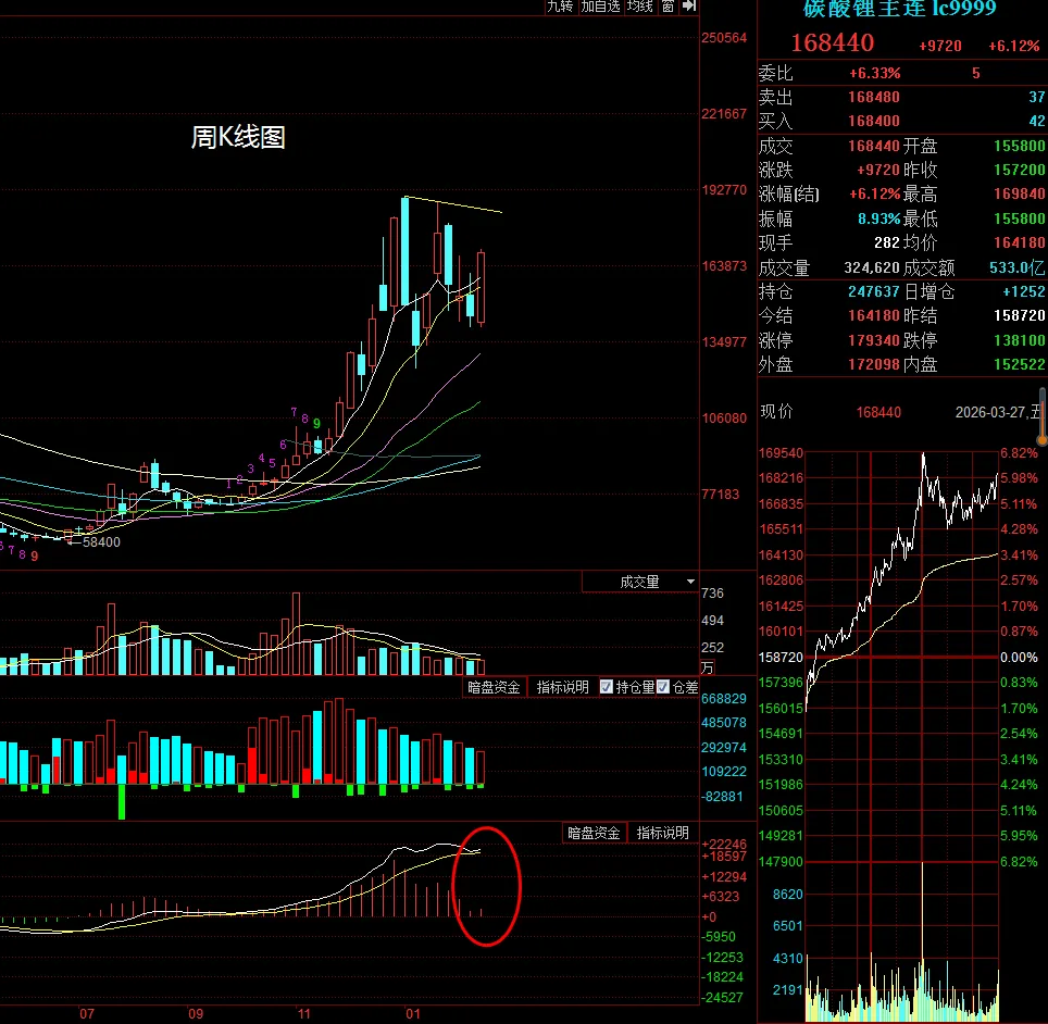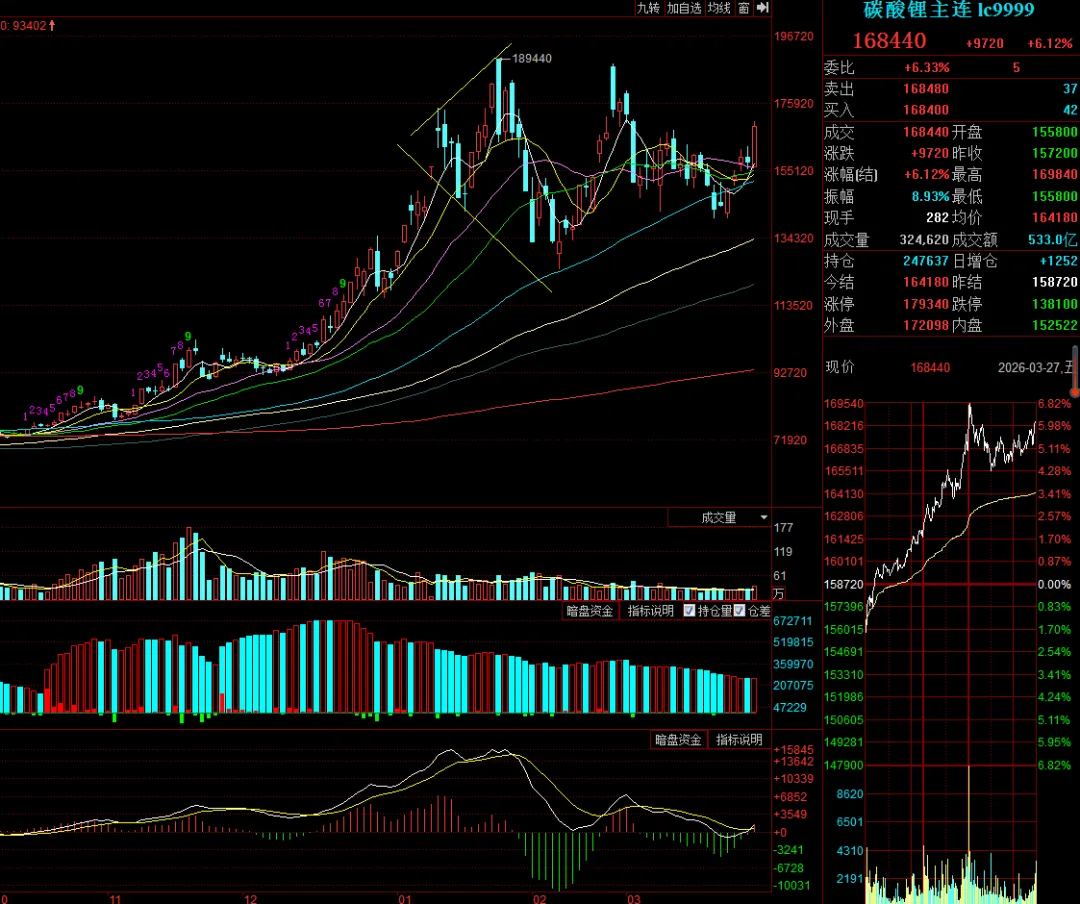 又到周末了,今天碳酸锂继昨天下跌之势,直接低开震荡走高,收盘价168440元,上涨6.12%,振幅8.93%。
