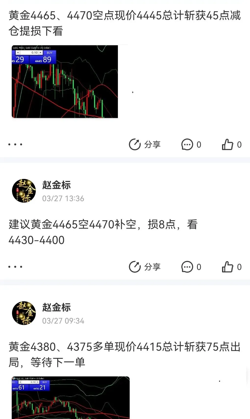 昨日操作回顾:黄金4380、4375多单在4390减仓在4415总计获利75点出局;黄金4465、4470空单4445减仓在4430总计获利75点出局;