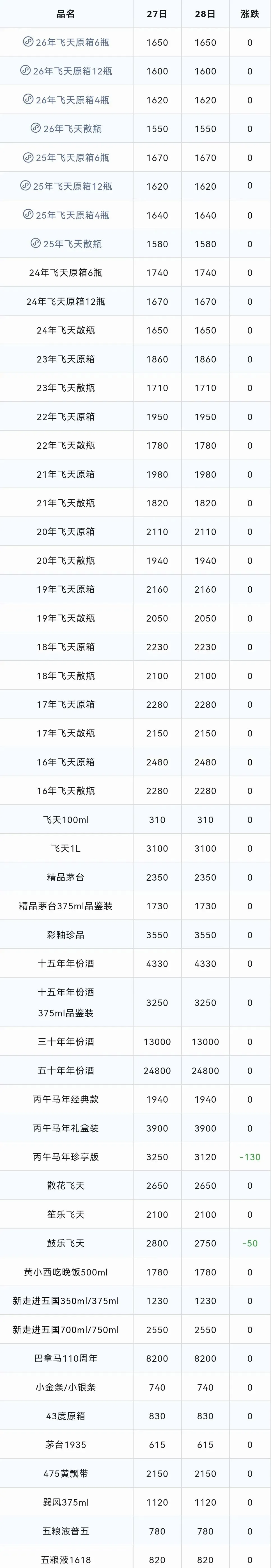 由于公众号平台修改了推送规则,如果不想错过“茅酒顾问”行情价,记得读完点一下“在看”,这样每次新文章推送才会第一时间出现在你的订阅列表里。今日(3月28日),从茅酒顾问发布的白酒价格行情监测数据显示,近段时间整箱茅台价格一直在1550徘徊,散瓶在1540左右,今日53度贵州飞天茅台(500ml)一批价跌至1650元左右!散飞在1550。