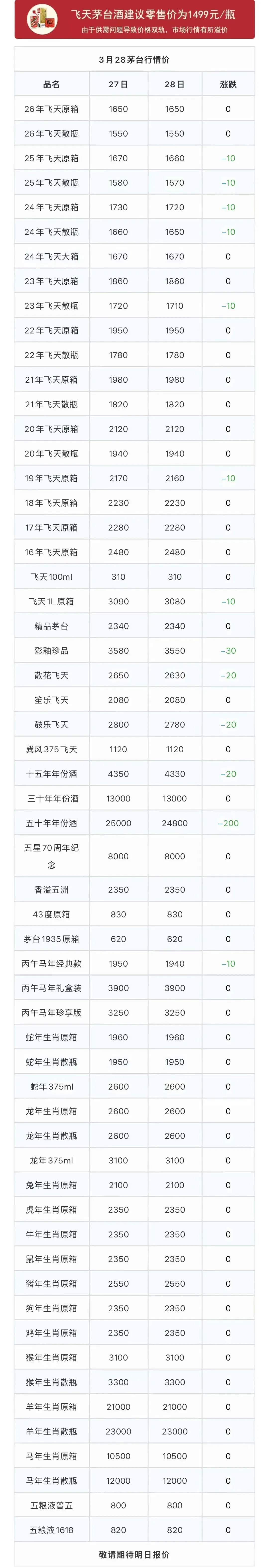 | *茅台酒价格小幅波动频繁,老酒受品相克重影响价格差异大,以实际成交价格为准! |