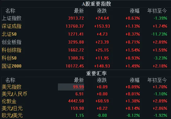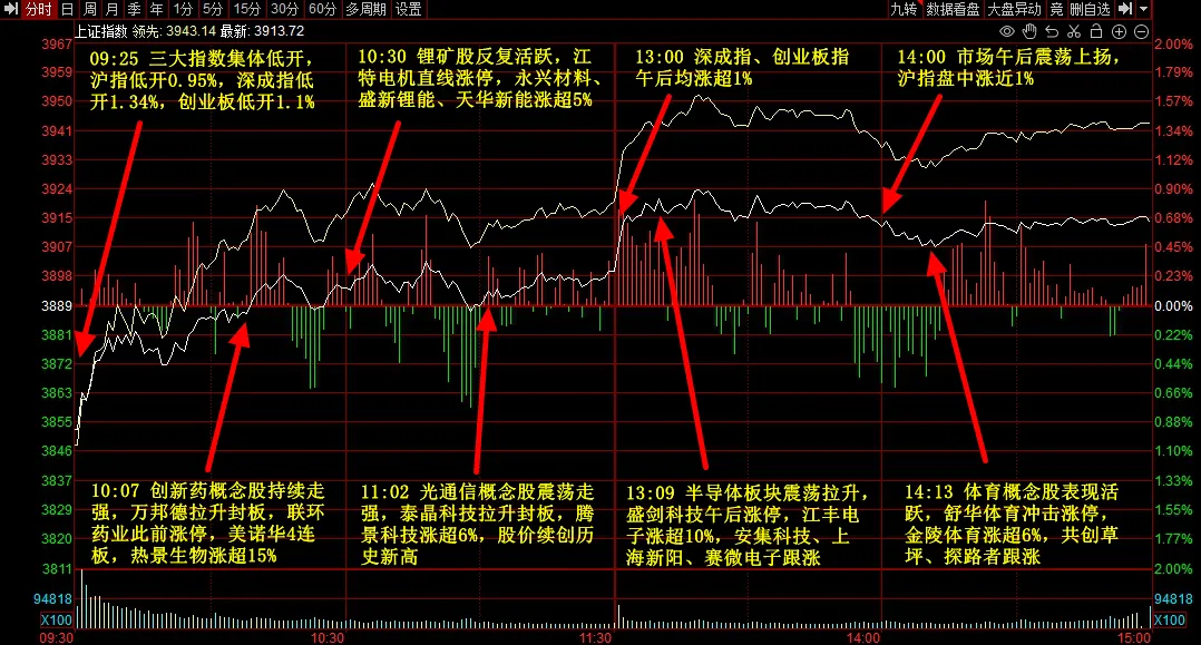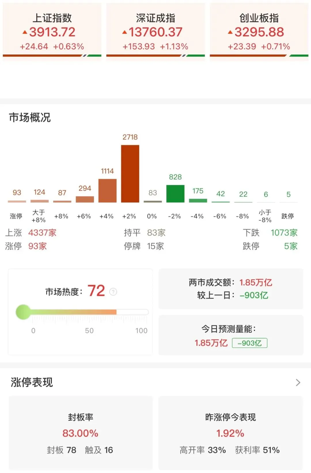 1️⃣ 指数速览📈 沪指:+0.63%,低开高走,收报3900+📈 深成指:+1.13%,创业板指:+0.71%,三大指数集体收红🎯 市场特征:成交额进一步萎缩至1.86万亿,创近期地量,但个股普涨超4300股上涨。锂电、医药两大板块爆发,华电辽能断板后电力板块集体调整,市场完成一次高低切换。