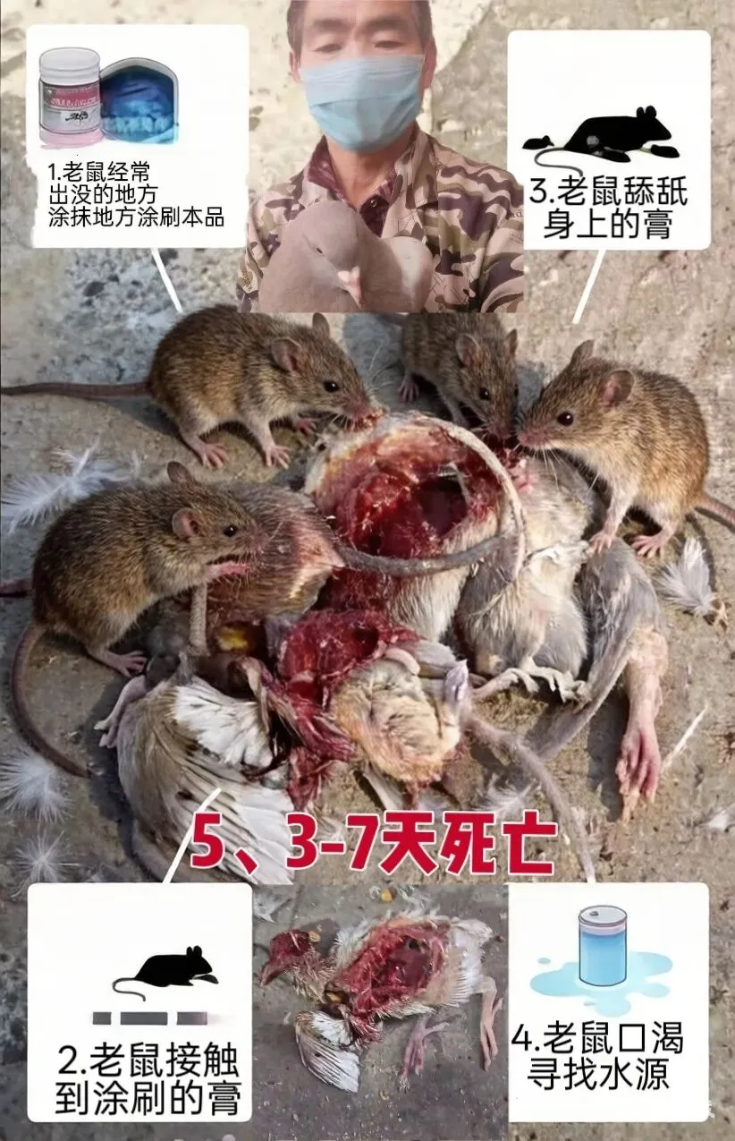 老鼠触碰到药,发痒舔舐中招而死,带到窝里染死一窝。对猪,鸡鸭鹅,鸽子等牲畜无害。放心使用
