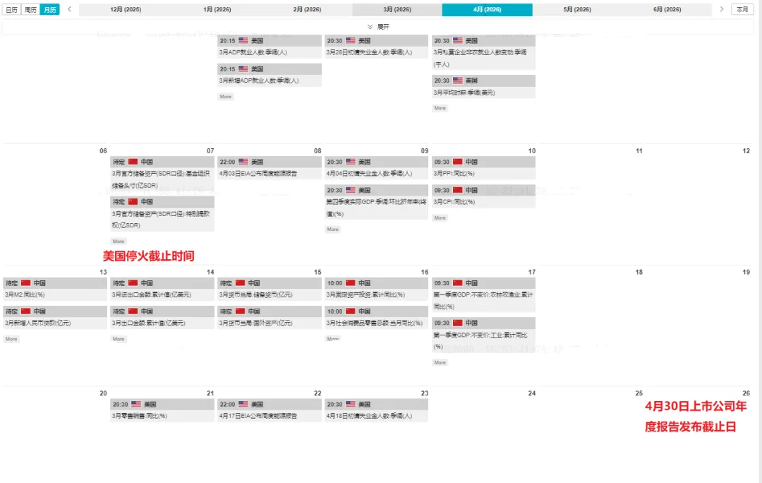4月重点关注一季度宏观经济数据、上市公司年报、美伊冲突进展等重要事件。