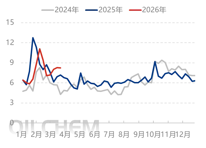 截至2026年3月25日,中国尿素企业预收订单天数8.24日,较上周期减少0.05日,环比减少0.60%。近期尿素企业出货顺畅,控制接单的同时积极发货,国内尿素企业主流订单天数变化较小,基本维持在一周以上,对尿素行情起到一定利好支撑。