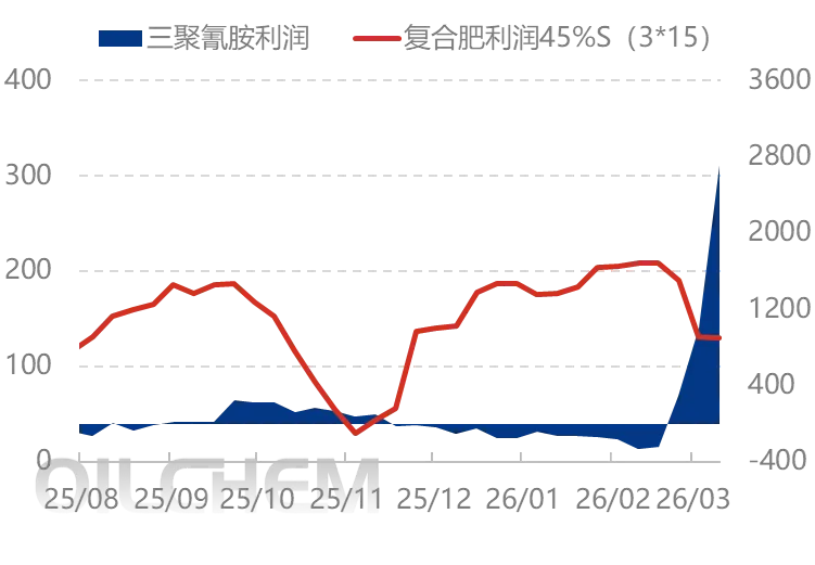 本期产业链利润涨跌不一。中东冲突持续,能源产品价格走高,运输加连带影响,煤炭价格上涨,而尿素价格受制于指导价影响平稳延续,所以尿素利润小幅收窄。下游复合肥价格虽然也有上调,但原料高位延续,成本继续走高,利润基本维持;而三聚氰胺得益于尿素价格的平稳,成品价格大幅走高,带动三胺利润大幅提升。