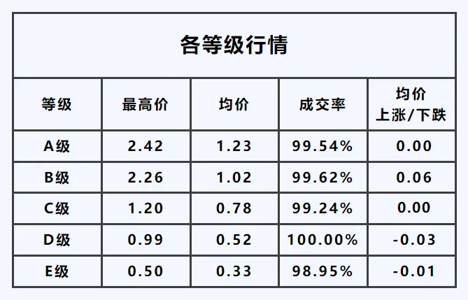 A级——最高价2.42元/枝,均价较昨日,下跌0.01元/枝;