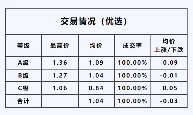 B1级——最高价1.12元/枝,均价较昨日,下跌0.05元/枝;
