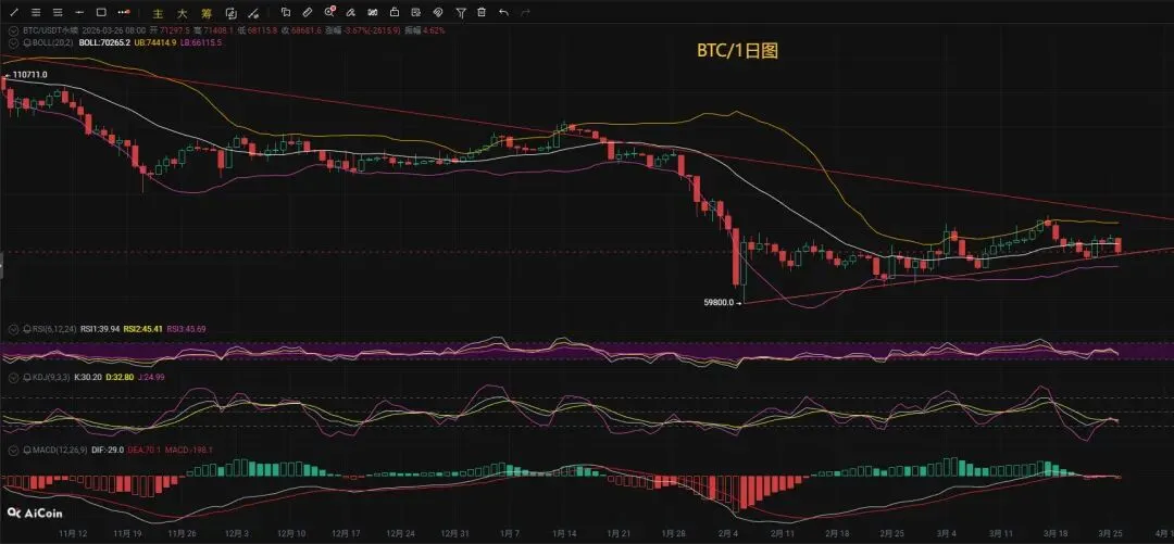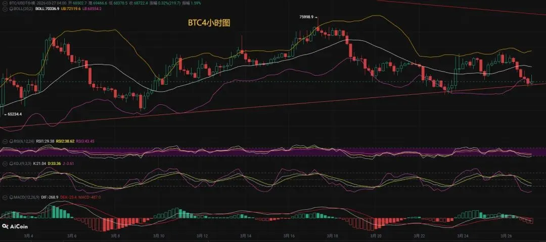 大饼四小时级别走势已明确跌破收敛三角形下轨69000关键支撑位,向下破位形态得到有效确认,短期行情变盘方向彻底转向空头,当前价格持续承压于MA20、MA30双重均线上方,短期均线组逐步形成空头排列格局,多头反弹动能被全面压制,MACD指标形成死叉后持续运行于零轴下方,空头能量柱稳步放量,DIF与DEA双线同步向下发散,空头势能保持充足态势,布林带轨道呈现开口向下的运行特征,价格紧贴下轨弱势下行,整体下跌趋势清晰明朗,上方70000整数关口构成短期核心压制位,该位置既是前期震荡整理中枢,亦是均线密集压制区域,反弹难以突破则难改弱势格局,下方68000为短期第一关键支撑位,此位置得失将直接决定后续下行空间能否进一步打开,同步联动的以太走势亦跟随大饼走弱,四小时级别同样维持弱势下行节奏,承压于短期均线压制,各项技术指标均释放空头信号,整体市场处于空头主导阶段,短线需紧盯关键支撑与阻力位的突破情况,切勿盲目抄底,静待明确企稳信号再做后续布局考量。